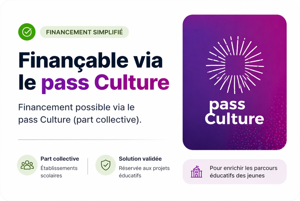 Nos interventions sont éligibles au pass Culture (part collective), un dispositif simple et accessible pour financer vos actions éducatives.